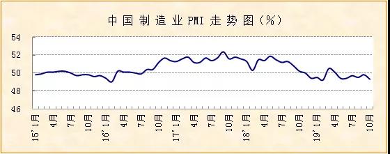 中國物流與采購聯(lián)合會、國家統(tǒng)計局服務業(yè)調(diào)查中心發(fā)布的2019年10月份中國制造業(yè)采購經(jīng)理指數(shù)(PMI)為49.3%,較上月下降0.5個百分點,創(chuàng)今年二季度以來較低水平。分項指數(shù)顯示,本月市場需求降至收縮區(qū)間,企業(yè)生產(chǎn)和采購增速放緩。
