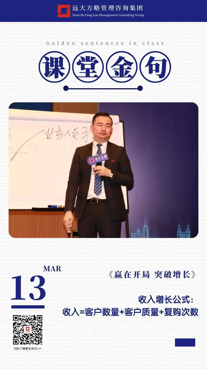 課上老師采用“道、法、術(shù)、器”相結(jié)合的形式給學(xué)員們帶來了一場(chǎng)精彩的知識(shí)盛宴。3月13日的課堂上兩位老師也總結(jié)了很多金句,可以很好的運(yùn)用到企業(yè)的經(jīng)營(yíng)管理中。為了幫助大家更好的吸收和鞏固兩天的學(xué)習(xí),小編整理了今天課程雷老師的部分金句分享給大家,希望能給大家?guī)砀鄦l(fā)。
