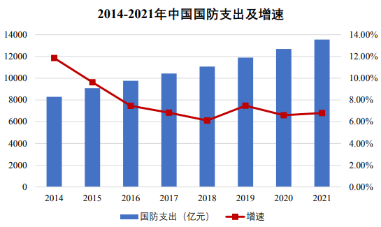 據(jù)統(tǒng)計(jì),2014 年至 2021 年我國國防支出年均復(fù)合增長率為 7.27%。2021 年