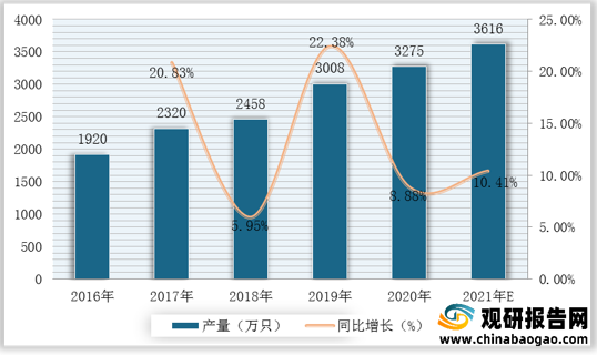 2016-2021年我國智能水表產(chǎn)量、增速及預(yù)測