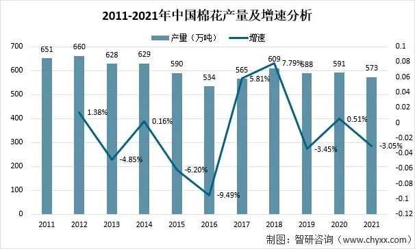 2021年,受種植效益和種植結(jié)構(gòu)調(diào)整等因素影響,種植面積降幅較大,帶動(dòng)中國整體棉花種植面積及產(chǎn)量下降。全國棉花總產(chǎn)量573萬噸,比2020年減少18萬噸,下降3.05%。