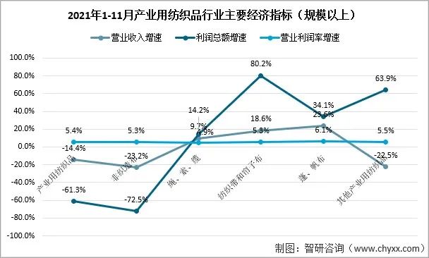 2021年1-11月產(chǎn)業(yè)用紡織品行業(yè)規(guī)模以上企業(yè)的營業(yè)收入同比下降14.4%,利潤總額同比下降61.3%,營業(yè)利潤率為5.4%。非織造布行業(yè)的營業(yè)收入和利潤總額分別同比下降23.2%和72.5%,營業(yè)利潤率為5.3%。繩、索、纜行業(yè)的營業(yè)收入和利潤總額分別同比增長9.7%和14.2%,營業(yè)利潤率為4.9%。紡織帶和簾子布市場延續(xù)了良好的發(fā)展勢(shì)頭,營業(yè)收入和利潤總額分別同比增長18.6%和80.2%,營業(yè)利潤率達(dá)到5.3%。篷、帆布的營業(yè)收入和利潤總額分別同比增長23.6%和34.1%,6.1%的營業(yè)利潤率為行業(yè)最高。醫(yī)療衛(wèi)生、過濾、土工用紡織品所在的其他產(chǎn)業(yè)用紡織品的營業(yè)收入和利潤總額分別同比下降22.5%和63.9%,營業(yè)利潤率為5.5%。