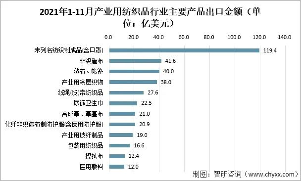 根據(jù)中國海關(guān)數(shù)據(jù),2021年1-11月我國產(chǎn)業(yè)用紡織品主要出口產(chǎn)品(按出口金額排名前十二類產(chǎn)品)的出口額為391.1億美元,同比下降53.0%。分產(chǎn)品來看,未列名紡織制成品(主要為口罩)目前是行業(yè)最大的出口產(chǎn)品,出口金額為119.4億美元,但因國外對(duì)口罩需求的大幅回落其出口額較上年同期下降了77.0%;氈布/帳篷、產(chǎn)業(yè)用涂層織物等傳統(tǒng)產(chǎn)品的出口額分別為40.0億美元和38.0億美元,同比增長52.7%和33.6%;合成革及革基布的出口額為21.0億美元,同比增長44.7%。非織造布及相關(guān)制品的出口呈現(xiàn)不同走勢(shì),卷材出口41.6億美元,同比下降9.0%,出口量126.0萬噸,同比小幅上漲0.8%,出口均價(jià)同比下滑9.8%;化纖非織造布制防護(hù)服(含醫(yī)用防護(hù)服)出口20.9億美元,同比下降80.2%;一次性衛(wèi)生用品出口22.5億美元,同比增長10.5%。