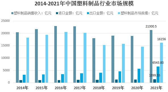受益于上游原材料價格上漲,國內(nèi)塑料制品市場止跌回暖。2021年我國塑料制品生產(chǎn)企業(yè)營業(yè)收入約21300.5億元,營業(yè)收入同比增長12.76%。2021年我國塑料制品行業(yè)市場規(guī)模約16156億元,市場同比增長10.7%。