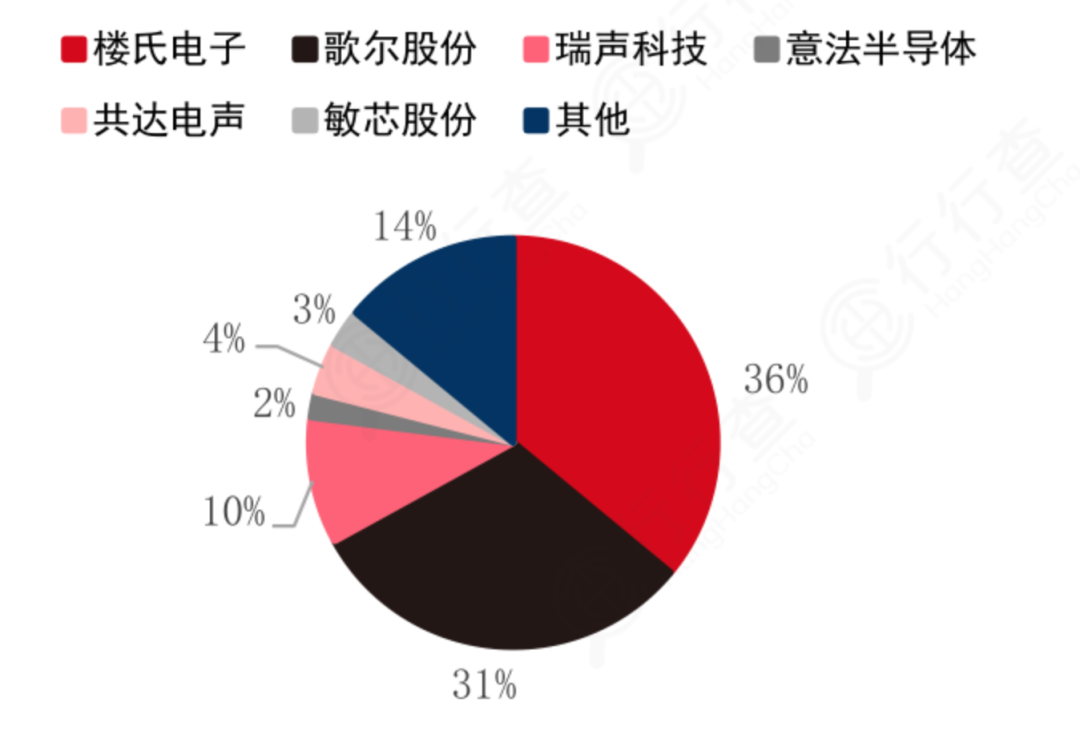 樓氏電子市場(chǎng)份額達(dá)36%,歌爾股份、瑞聲科技、共達(dá)電聲、敏芯股份市場(chǎng)規(guī)模分別達(dá)到31%/10%/4%/3%,合計(jì)占據(jù)48%。
