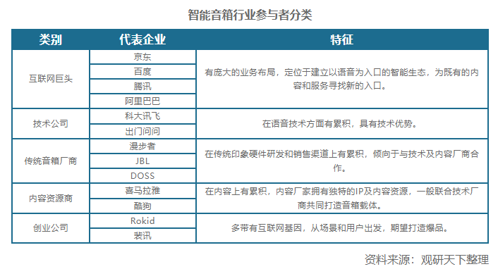 2011年美國(guó)亞馬遜開始了智能音箱的研發(fā),并于2014年發(fā)布了Echo智能音箱,由此智能音箱行業(yè)起步發(fā)展。隨后谷歌、蘋果等相繼發(fā)布智能音箱產(chǎn)品,行業(yè)進(jìn)入爆發(fā)式增長(zhǎng)階段。2015年京東聯(lián)合科大訊飛推出的叮咚智能音箱則是國(guó)內(nèi)智能音箱行業(yè)的先行者,此后隨著行業(yè)向好,參與者不斷增多,主要分為互聯(lián)網(wǎng)巨頭、技術(shù)公司、傳統(tǒng)音箱廠商、內(nèi)容資源商、創(chuàng)業(yè)公司五大類。