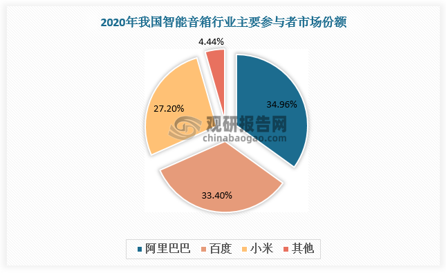 從市場(chǎng)集中度來(lái)看,我國(guó)智能音箱行業(yè)集中度高,且呈現(xiàn)不斷加強(qiáng)趨勢(shì)。數(shù)據(jù)顯示,2019-2020年我國(guó)智能音箱市場(chǎng)CR3由92.7%上升至95.6%。從競(jìng)爭(zhēng)格局看,智能音箱市場(chǎng)呈現(xiàn)阿里巴巴、百度、小米三足鼎立市場(chǎng)格局,2020年市場(chǎng)份額分別為34.96%、33.4%、27.2%。