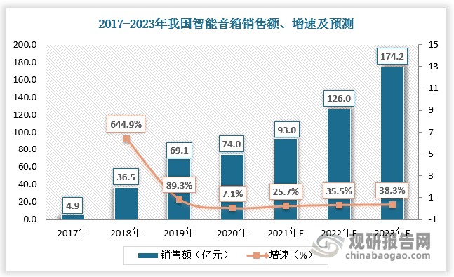 數(shù)據(jù)顯示,2019年我國(guó)智能音箱出貨量達(dá)0.46億臺(tái),較上年同比增長(zhǎng)109.1%;2020年受疫情影響以及廠商價(jià)格補(bǔ)貼力度的減小,我國(guó)智能音箱出貨量有所下降,為0.37億臺(tái),增速為-19.6%;2021年隨著疫情向好以及市場(chǎng)受到智能家居設(shè)備使用增加的推動(dòng),國(guó)內(nèi)智能音箱出貨量回升,約為0.42億臺(tái),增速為13.5%。