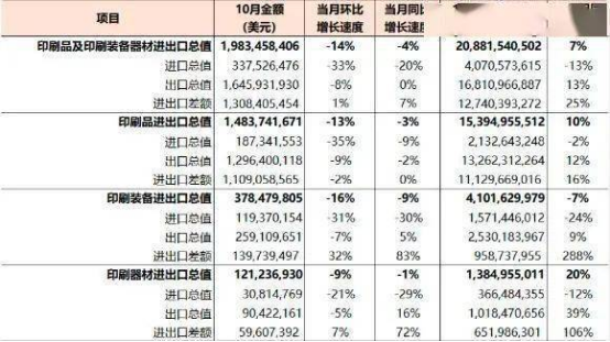 在2022年1-10月國內印刷品、印刷裝備、印刷器材進出口總值為208.82億美元,與去年同期相比增長7%。其中,進口40.71億美元、出口168.11億美元。國內印刷品、印刷裝備和印刷器材進出口貿易順差合計127.40億美元。