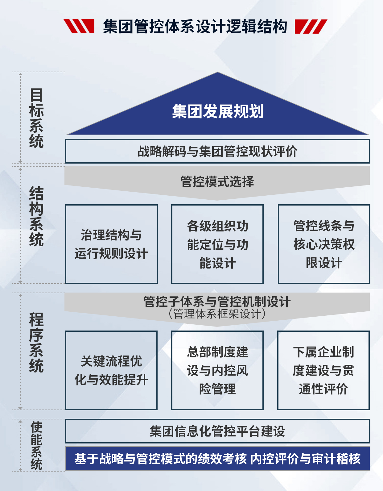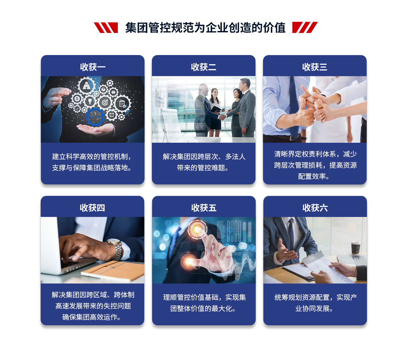 4、項(xiàng)目成果:支撐集團(tuán)戰(zhàn)略落地,提高集團(tuán)整體的運(yùn)營(yíng)效率;減少因跨層次管理帶來(lái)的損耗,提高集團(tuán)內(nèi)部資源配置效率;建立一套廣譜、可復(fù)制的管控模式;解決集團(tuán)因跨區(qū)域、跨體制、高速發(fā)展帶來(lái)的失控問(wèn)題,確保集團(tuán)高效運(yùn)作;理順管控價(jià)值基礎(chǔ),實(shí)現(xiàn)集團(tuán)整體價(jià)值的最大化;打造強(qiáng)勢(shì)總部,解決集團(tuán)總部空心化、文職化等問(wèn)題。
